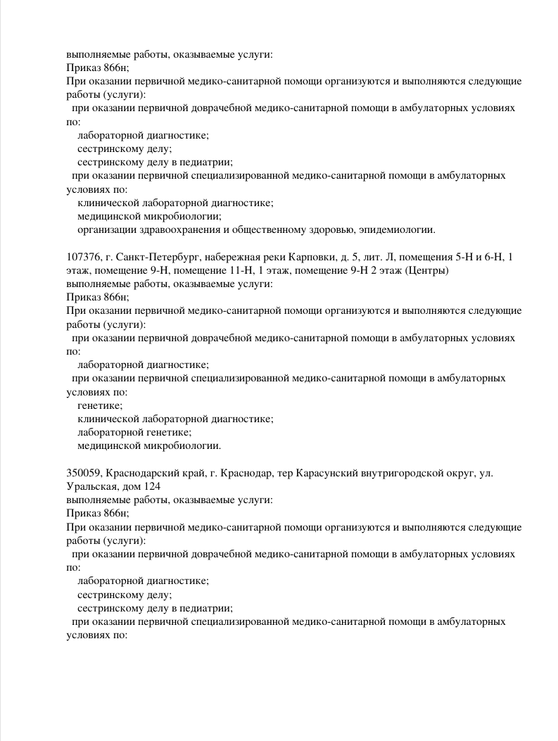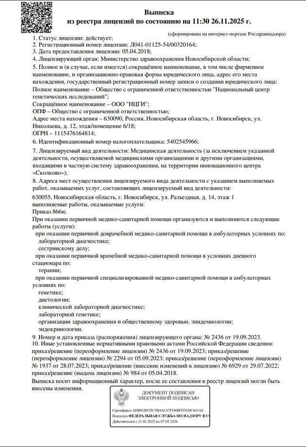 Все анализы выполняются методами ПЦР и секвенирования нового поколения (NGS). Точность результатов — до 99,9999%.